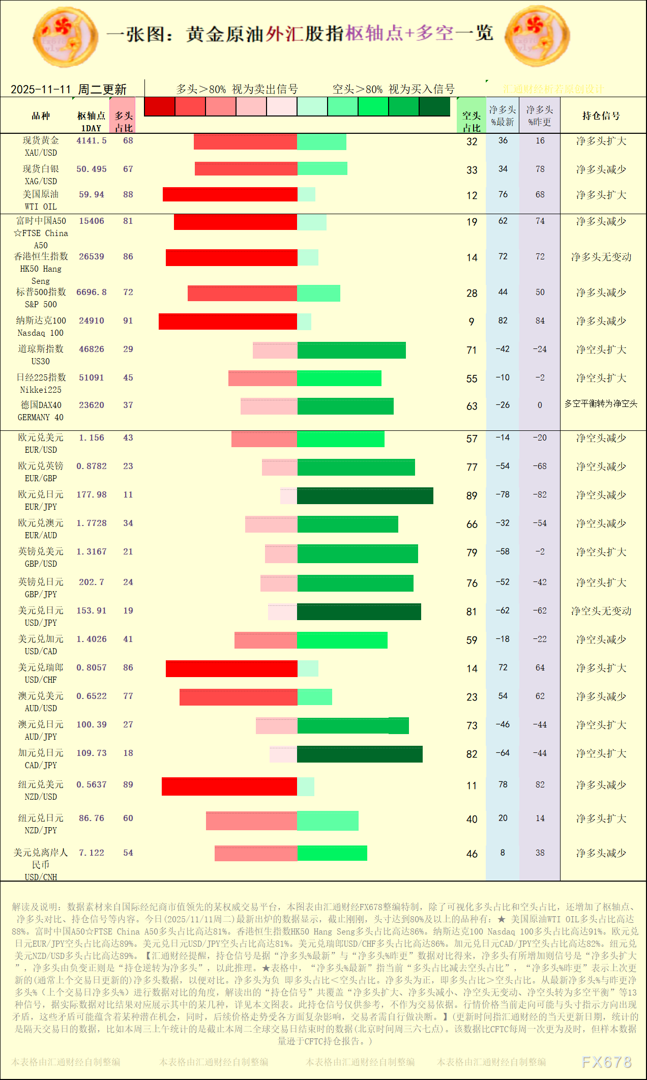 EBC外汇官网:一张图:2025/11/11黄金原油外汇股指“枢纽点+多空持仓信号”一览